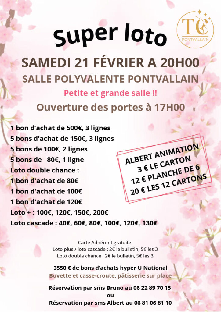 Loto – Twirling Bâton + Ajouter à mon Agenda Google + Exporter vers iCal L'événement est terminé. Date 21 février 2026 Heure 20 h 00 min Lieu Salle des fêtes Pontvallain Catégories Animation Association Loto Organisateur Twirling Club Téléphone 06 22 89 70 15 ou 02.53.15.20.43 Email bruno.pousset@hotmail.fr Site Web https://tc-pontvallain.clubeo.com/ Partagez cet événement