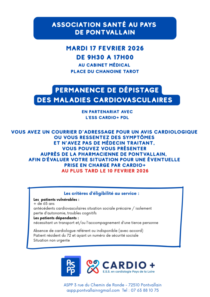 Permanence de dépistage des maladies cardiovasculaires ASPP dépistage Cardio+ + Ajouter à mon Agenda Google + Exporter vers iCal 00 jours 00 heures 00 minutes 00 secondes Date 17 février 2026 Heure 9 h 30 min - 17 h 00 min Lieu Cabinet Médical Place Chanoine Tarot - 72510 Pontvallain Catégories Santé Organisateur ASPP Association Santé au Pays de Pontvallain Email http://asps.pontvallain@gmail.com Partagez cet événement