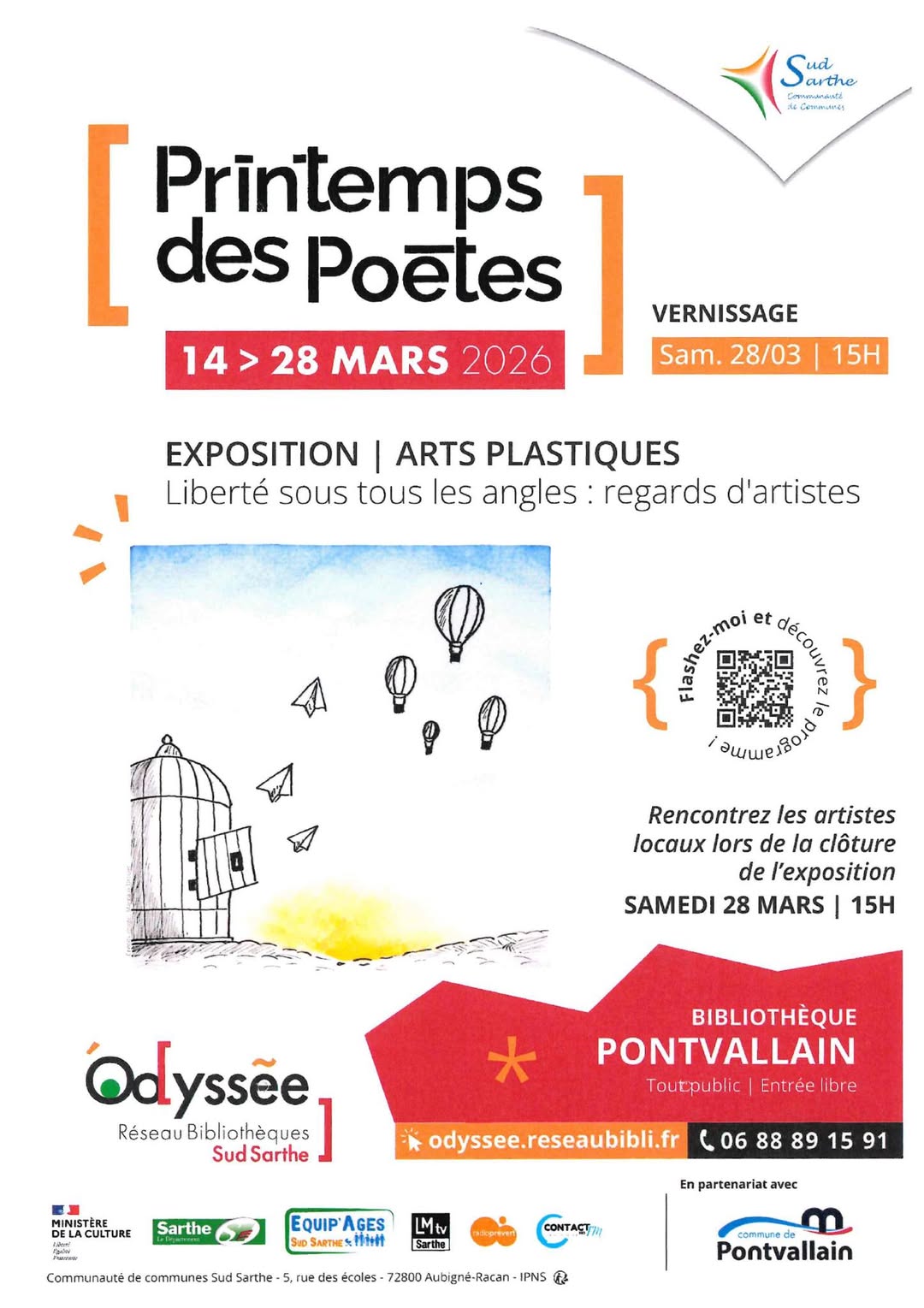Printemps des poètes + Ajouter à mon Agenda Google + Exporter vers iCal 00 jours 00 heures 00 minutes 00 secondes Date 28 mars 2026 Heure 15 h 00 min Lieu Bibliothèque de Pontvallain Arrière-cour Mairie Catégories Exposition Organisateur Communauté de Commune Sud Sarthe Téléphone 02 85 29 12 00 Email accueil@comcomsudsarthe.fr Partagez cet événement