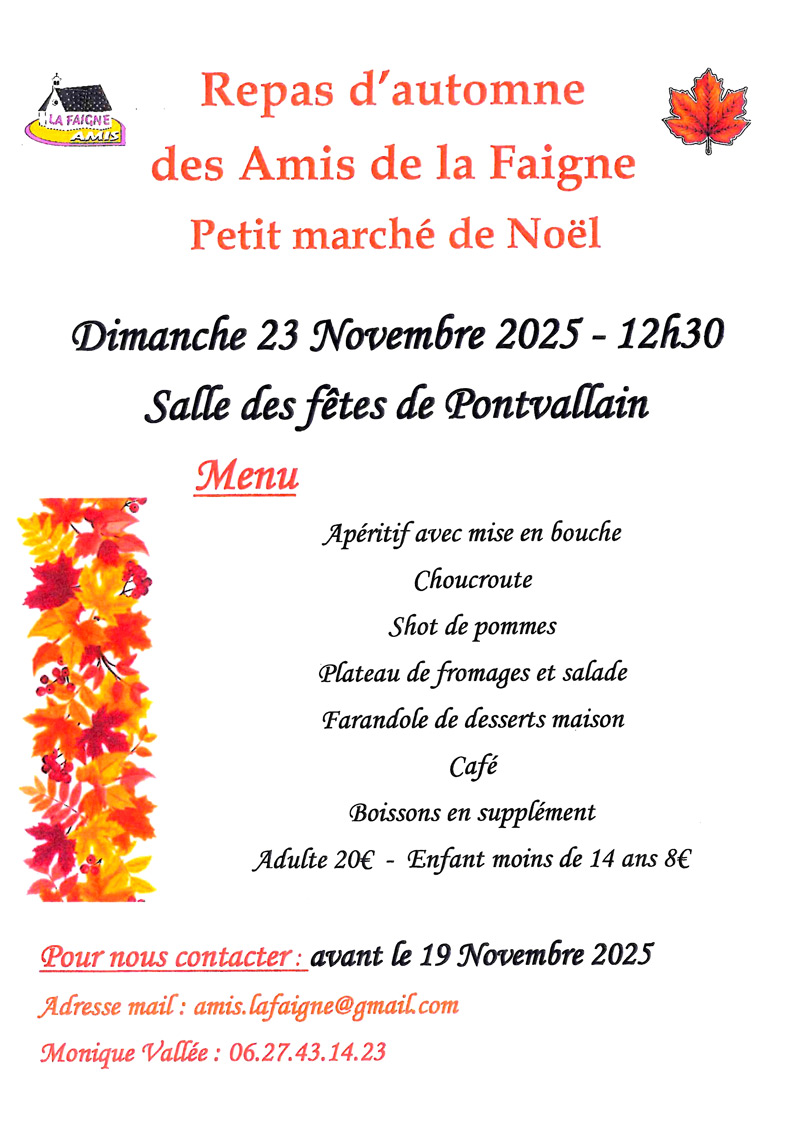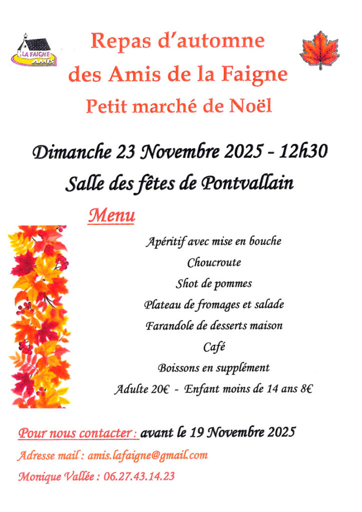 Repas d’Automne les Amis de La Faigne Repas d’automne des Amis de La Faigne Venez à notre Repas d’automne profiter d’un moment convivial Dimanche 23 novembre 2025 des 12h30 Salles des fêtes de Pontvallain Pensez à vous inscrire ! Contactez-nous : amis.lafaigne@gmail.com + Ajouter à mon Agenda Google + Exporter vers iCal 00 jours 00 heures 00 minutes 00 secondes Date 22 - 23 novembre 2025 Heure 12 h 30 min Lieu Salle des fêtes Pontvallain Catégories Association Repas Organisateur Les Amis de la Faigne Téléphone 02 43 46 32 14 Email amis.lafaigne@gmail.com Site Web https://fr.wikipedia.org/wiki/Chapelle_Notre-Dame_de_la_Faigne Partagez cet événement