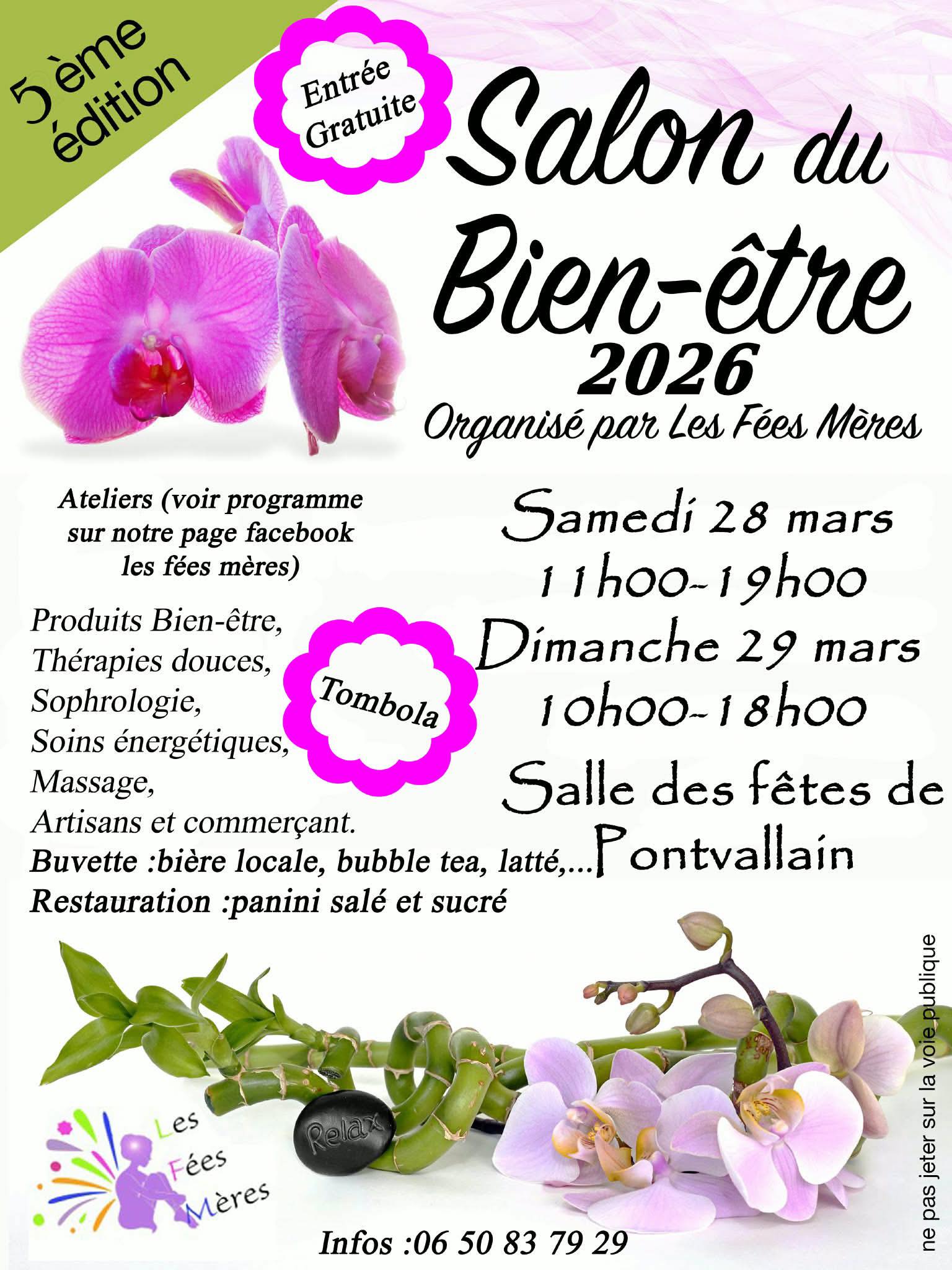 Salon du Bien-être + Ajouter à mon Agenda Google + Exporter vers iCal 00 jours 00 heures 00 minutes 00 secondes Date 29 mars 2026 Heure 10 h 00 min - 18 h 00 min Lieu Salle des fêtes Pontvallain Catégories GRATUIT Salon Organisateur Les Fées Mères Téléphone 06 50 83 79 29 Email lesfeesmeres72@hotmail.com Site Web https://www.facebook.com/LesfeesmeresPontvallain Partagez cet événement